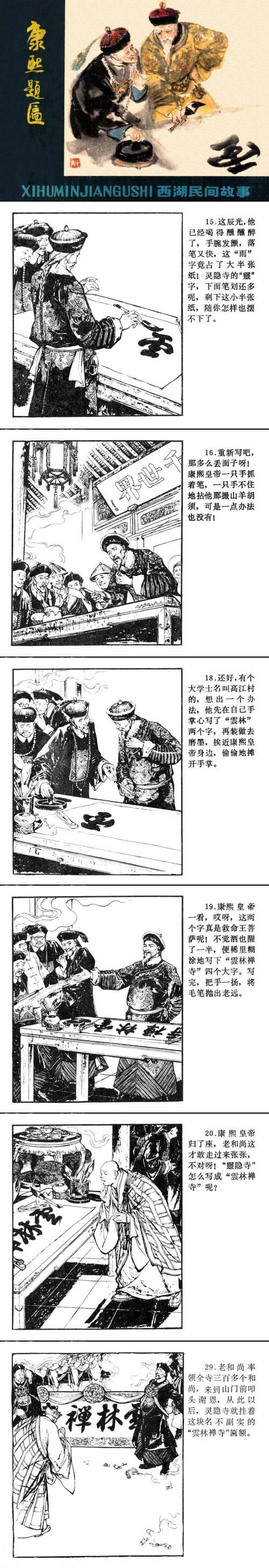 我小时候有本《康熙题匾》的连环画,说的是康熙皇帝南巡期间游览杭州灵隐寺,主持想请皇上赐匾,结果康熙把“靈”字上面的雨字头写大了,下面的“巫”字写不下,于是一个叫高江村的大学士出主意说可以改作“雲林”,于是康熙就写下了“雲林禅寺”四个字,从此将错就错灵隐寺就改称云林禅寺了。虽然这是段子,但即使现在去灵隐寺,还会听到导游讲这个故事。