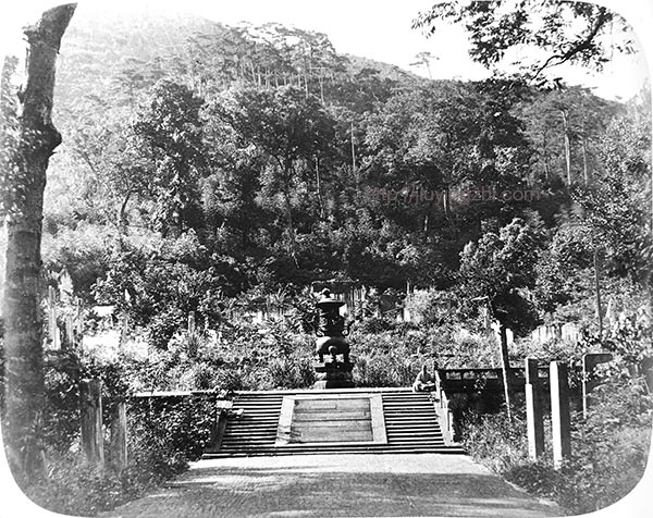 被太平军烧毁的大雄宝殿遗址,只留下台基和明万历庚子年铸造的香炉,1860-1869年间拍摄