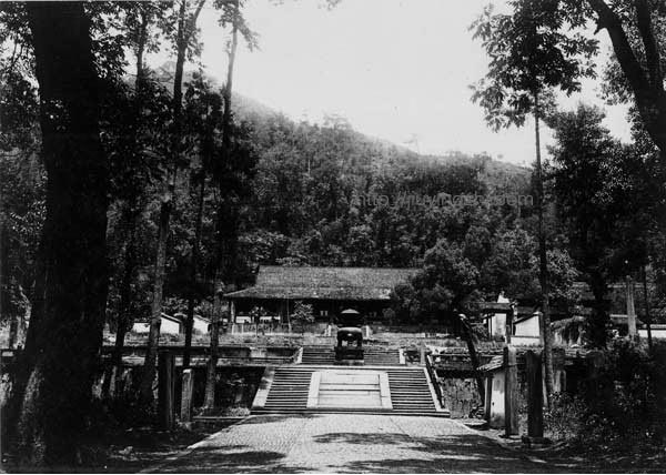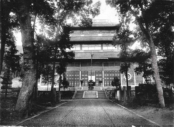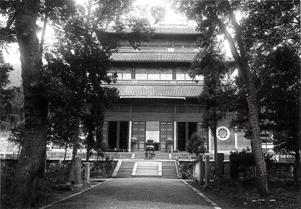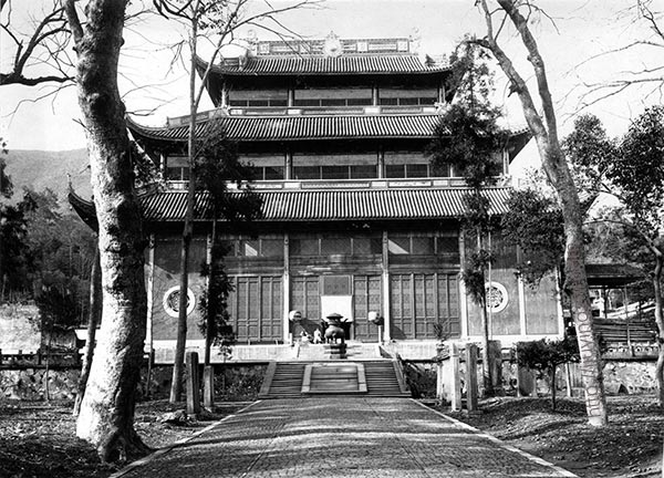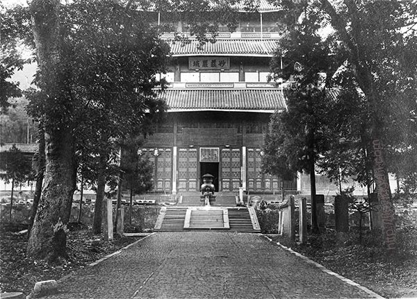 灵隐寺创建于东晋咸和元年(326),相传是印度僧人慧理见此处景色奇幽,认为是“仙灵所隐”,便建寺“灵隐”。五代时吴越国王钱俶笃信佛教,使灵隐寺成为江南地区的佛教名刹。灵隐寺自创建以来,历经十余次毁坏和重建。1860年太平军占领杭州城,灵隐寺的大雄宝殿被毁,直到1910年盛宣怀出资,选用美国红松重建了大雄宝殿。巧合的是,不同时期都有不同的摄影师以类似的角度拍摄过灵隐寺大雄宝殿,放在一起看别有一番时光流逝的沧桑感。