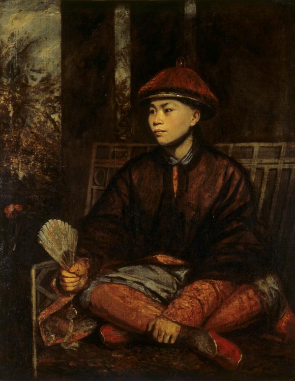 张荫桓是位艺术品爱好者和收藏家,无论走到何处,博物院是一定要去的,而且对油画、雕塑、埃及文物颇有一番见解。他造访诺尔庄园,被其中收藏的各种艺术品所吸引,特意记录在日记中,“楼上四围可通,满壁油画,及极古几榻,有英君主临幸之室,陈设皆银器,桌亦雕银为之,卧榻帐幔刻金线织成,费英金两千镑。有雕镂木橱一架,珊瑚作柱,可云奢矣。楼上最古之物则未制钟表以前测日之器,又吾华五彩磁瓶一,口径五尺,亦非近代物也,其他磁器多可观。”在众多的油画收藏中,他还注意到了很特别的一幅,“所悬油画皆西俗有名望人,中有少年华人一轴,戴无顶帏帽,短衣马褂,赤脚曳番鞋,款署黄亚东,不知何许人,彼族如是重耳。”当时张荫桓不知这位“黄亚东”是何许人,但后来的艺术史学家们已经大体弄清了事实。黄亚东大约出生在1753年,广东人,作为当时中国唯一的贸易口岸,黄亚东有机会接触外国人。当他大约十几岁的时候,听到有关英国的传说,于是决定去英国看看。东印度公司的押运人布莱克(John Bradby Blake)也是位自然学家,他看中黄亚东认识很多草药,决定带他去英国。1775年后,他成为乔凡娜·巴塞利的男侍者,而这位乔凡娜则是诺尔庄园主人,第三代多塞特公爵约翰·萨克维尔的情人,多塞特公爵还安排黄亚东去庄园附近的“七橡树”学校上学。也许是中国人在英国实在太少见,多塞特公爵在1776年付了70个金币(guineas)给大画家雷诺兹(Joshua Reynolds)为黄亚东画了一幅油画肖像,并悬挂在诺尔庄园的雷诺兹厅。1874年,黄亚东回到广东做外贸生意。据信,他是最早前往英国的中国人之一。