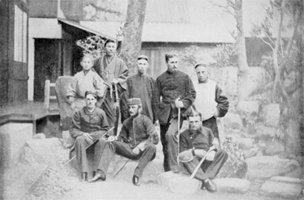 萨道义书中那张合影,从左至右,后排:Yasu、Noguchi、Akum、Mitford、Linfu;前排:Satow、Cardew、Thalbitzer