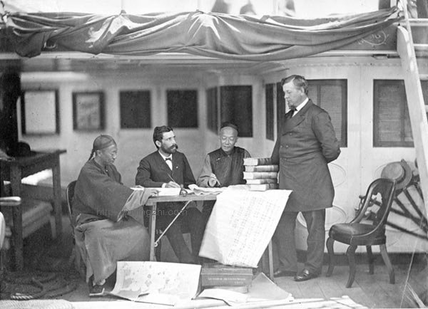 另一个我没有考证过名字,但在1871年美国和朝鲜的军事冲突(朝鲜称之为“辛未洋扰”)中,美方聘请比托为随军摄影师,在他于美舰上拍的一张照片是两名中国“师爷”和两名美国人在讨论给朝鲜的公文书写。在甲午战争之前汉字在朝鲜的社会地位很高,是知识分子的标志,这就能理解为什么当时美国人写给朝鲜官方的文书还要配上中文,而这些中文要由中国人来书写。