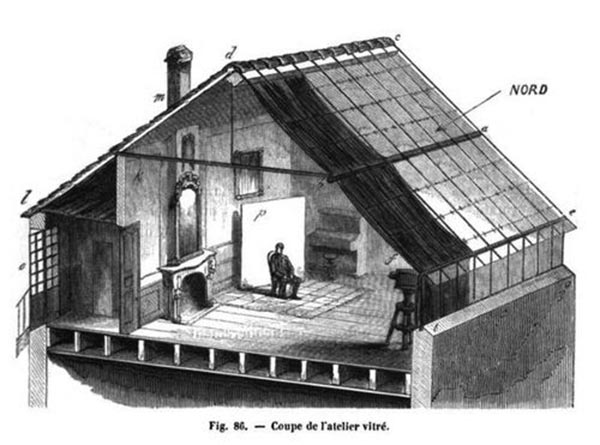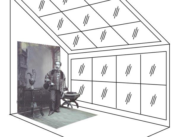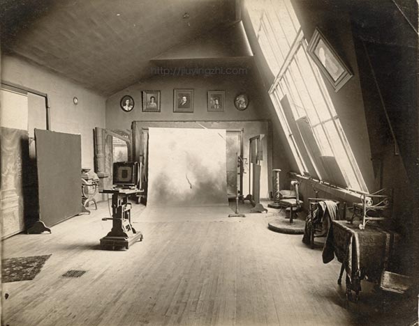 在电灯没有普及之前,照相馆都只能依靠自然光拍照,所以十九世纪的照相馆大都设在二楼,朝南一侧不仅有高大的落地窗,还会开天窗。这两面的窗户会有窗帘,针对被摄对象身体的具体部位还有小的遮光板(前阵子跟某剧组混了几天,行话似乎管这个叫“拍子”),为了避免摄影师和照相机也留下影子,场景布置往往是和光线方向不完全垂直的,完全遮光的黑窗帘会拉到摄影师身后的位置等等。要布置完美的光区且得费一番功夫,从这些小细节也能看出照相馆的水平。