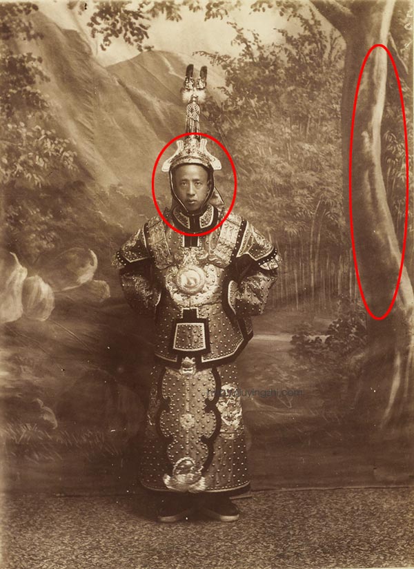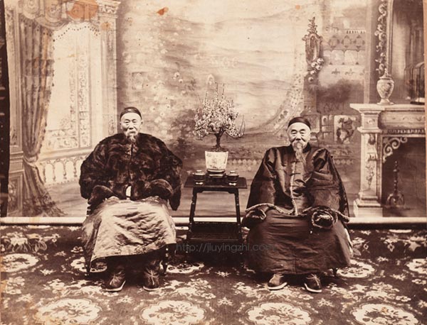 源于肖像画的习惯,照相馆在拍摄肖像照的时候也要布置些小家具啊、廊柱啊、背景布什么的,这里面背景布最重要,决定了这个被设计的环境的基调,其他陈设都是这个基调的点缀。这一套方法也随着摄影术的传播从欧洲走向世界,到了中国,当然要本土化一些,比如背景的内容会是中式的,家具陈设也是中式的。这些设计的元素都是皮毛,很好学来的,但要想把这些元素和谐地组合在一起,最终在照片上(较为)真实地呈现被设计的那个环境就需要费些心思了。如果照片里被设计的元素都不搭,那挂一张大背景布还不如换一幅小画替代。以前我只思考到这儿,但是看了这张日意格的照片后,觉得背景布上的光也很重要。