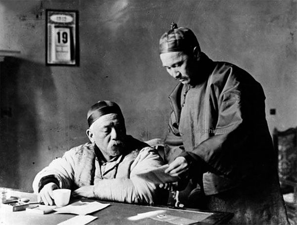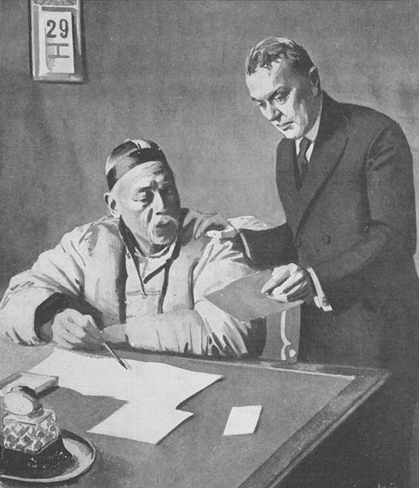 如果说这种换件衣服的照片还算无关大雅的话,那用上“换头术”的照片就真值得批判了。袁世凯的政府组阁后,聘请了数位外国人作政府的外籍顾问,其中包括久居中国,曾任《泰晤士报》记者的莫理循。中外舆论对北洋政府的这一决定褒贬不一,莫理循确实热爱中国文化,曾广收和中国有关的书籍、地图和照片,在位于王府井大街的家中建了一座图书馆,后来这些收藏转售给日本的三菱财团,成为构建著名的东洋文库的基石。甚至北洋政府曾将今天的王府井大街更名为莫理循大街。反对的声音主要是因为这些外国顾问毕竟不是中国人,是否真能站在中国的立场上作出判断抱有怀疑。譬如1912年8月31日英国版的《伦敦新闻画报》头版一整版刊登了袁世凯和莫理循的一张合影:老袁一身便服坐在桌后,手里拿着笔指着桌上的一份文件,转头看着站在旁边的莫理循出示的一张信纸,似乎两人正在讨论政务。这样的构图和肢体语言明白地向读者传达出一种信息:莫理循作为英国公民,潜台词即英国政府,对袁世凯代表的中国政府有着重要的政治影响力。但实际上这是一张造假的照片,据莫理循在回忆录中说:“许多图片新闻刊载有我的画像,最有趣的是伪造我站在袁世凯身旁并以一份文件请其过目的那张画像。这是总统和他的秘书蔡廷干的快照,不过蔡的头被我的头取而代之了。”这张照片的原照实际上是这张,不仅老袁手里的茶杯被换成了笔,甚至后面的日历也从19日换成了29日。