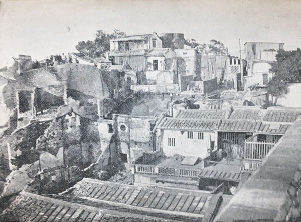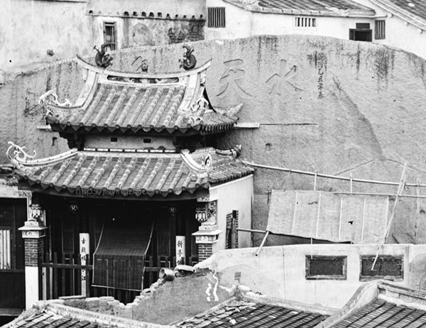 这张照片是在一座建筑的露台上拍摄,左边的建筑已经是断壁残垣,右边的还基本完好。从巨石上“色”的位置那一片中间发白外圈发黑的颜色看来,这应该是过火的痕迹。如果火是从下面着起来的,按说右边紧邻的建筑,甚至拍摄者所在的高楼都很难幸免,但如果火是从水仙宫开始着再向下蔓延的话,似乎能有更多时间阻断火势来保全周围的建筑,且过去有香火的寺庙本来也是最容易着火的。这也可以解释了为什么巨石上四个字中目前唯有“色”最不清楚:应该是这里烧的时间最长,高温的烤炙让这部分石面崩裂了。网上有种说法认为水仙宫毁于民国时候,但从这张照片看应该在1895年以前就被烧毁了。此后水仙宫有没有重建?也许有,因为有书里说其中供奉的五位神仙塑像在水仙宫废后移寄东岳庙[2],看这照片里遗迹的情况,神像断不可能幸存,只可能是重建后新塑的。结合现在巨石上仅有一个大洞(疑似佛龛)和陈迈伦的诗,也许水仙宫最初也是仅祀大禹一位,后来重建才加了四位有了奇怪的组合。以上纯属瞎猜,没有文献支持。五行讲究水克火,没想到火反过来把可以治水的小庙克了。