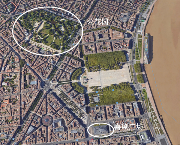 被改为会堂的大戏院即喜剧广场上的波尔多大剧院(Grand Théâtre),1780年落成。后来他们有去了“河岸”边的“石楼前”,即交易所广场(Palace de la Bourse),1869年在其上修建了三女神喷泉,只是德彝将女神所挟的水罐误为“铜炮”。