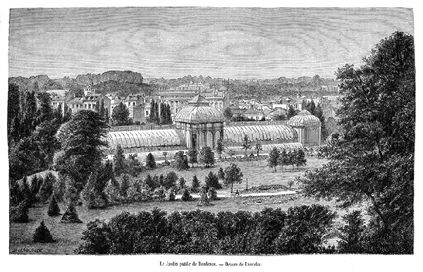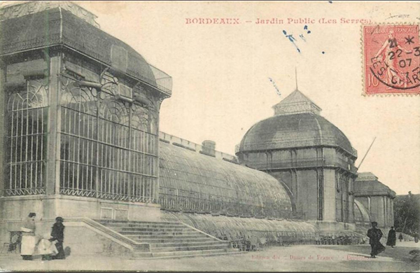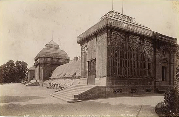 “集新院”即博物馆,德彝等人在波尔多最先去逛的就是那里。从他的几本日记看的出来他对自然历史类的博物馆很感兴趣,每去一个新城市都会参观。根据一张1890年的波尔多城区图,博物馆应该在喜剧广场(La Place de la Comédie)的西北角,可惜他们去的时候里面存放着“军器”,吃了闭门羹。于是他们改去了“公花园”(Jardin Public),当时的波尔多自然与历史博物馆(Musée d’Histoire Naturelle)就设在其中。他在日记中提到的那座“铁架玻璃房”很先进,配有地暖设施,所以培育的植物品种也多。这座玻璃温室建于1855年,最高处17.5米,总长90.6米,曾是欧洲最好的植物温室之一,1931年被拆除,现在原址是一座砖混建筑。