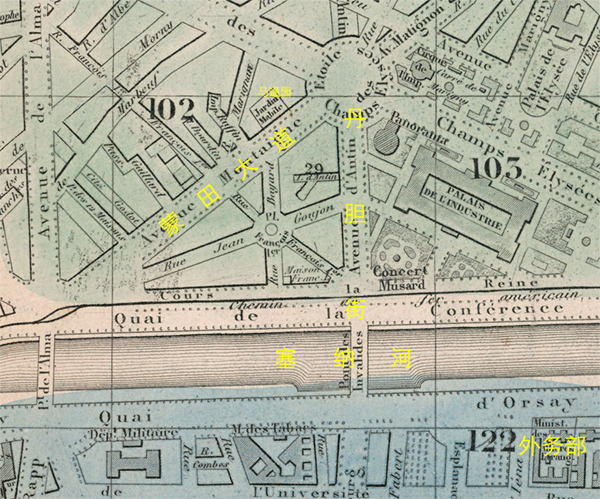 法外务部在塞纳河南岸的Quai d’Orsay,我在Google Earth里以这里为圆心,一公里为半径(考虑行车路线不会是直线,加个余量),考虑“左近凯歌路,右临思安江”,使团的寓所应该在今塞纳河以北、蒙田大街(Avenue Montaigne)与富兰克林·罗斯福大街(Avenue Franklin Delano Roosevelt)围城的三角形中。查1870年和1871年的巴黎地图,知富兰克林·罗斯福大街当时称为安坦大街(Avenue d’Antin),d’Antin发音和“丹胆”接近,且这里和后来德彝他们游玩各处的距离基本符合,更重要的一条线索,德彝提到他们住的地方“对户小园,周约二里,绕以铁阑,高五尺,盛花卉,密列铁椅。中一乐亭甚高,上坐乐工三十余人,萧笛之声,悠然可听。后一酒房,卖加非、舍利、糕饼小食。每日自戌初至子正止,忽而鼓乐,忽而歌曲,灯烛辉煌,其门如市。入者每人二方,合银二钱六分零。非男女携手同入,则屏而不纳。”后来德彝终于进到这个园子里转了转,称其为“马逼园”,现在的巴黎已经找不到这样一个地方,但是在当年的地图上可以看到蒙田大道靠近现在的富兰克林环岛,也就是当年的Etoile des Champs Elvsées路北有个地方叫Jardin Mabile,也就是德彝说的“马逼园”。通过这几条线索就可以把使团在巴黎的第一个住处位置确定下来了。