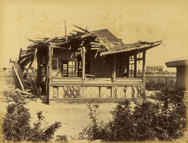 申初,复乘车少游,见王宫左鄙一带,空墙矗立,红焰犹存。宫后埃及石柱下之铁阑,曲弯折毁,其四角石台亦被轰坏。宫旁立伍力街之市市廛楼房长约里许者,率皆焚毁,乱石堆积如山。腊佩巷前,万洞坊之铭胜铜柱,被炮击碎,铜块纷飞。马兰达礼拜堂前罗雅弄之铺户,焚毁无一存者。凯歌路北之石牌楼,被炮子穿成巨孔。有叛勇所掘之河,筑以石壁,将浸水之毡布覆于其上,以御枪炮。瓦砾遍城,可怜焦土。酉正回寓。