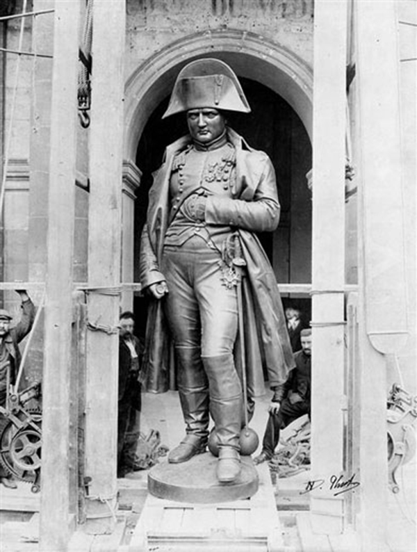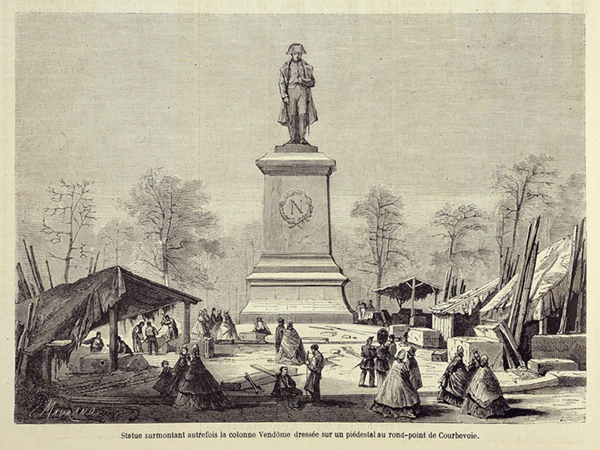 “大石牌楼”即凯旋门,“马业门”即马约门,出了这座城门,德彝他们沿着笔直的大道:先是Avenue de Neuilly,然后是Avenue de St. Germain走了十余里到了“得米石”,我认为他说的是现在的La Defense附近,因为那里的Rond Point de Courbevoie曾经有座高大的石台,石台上面是拿破仑一世的铜像。这座铜像高4米重5吨,1833年铸成,铜料来在1805年在多瑙河谷战役以及波美拉尼亚战争中缴获的奥地利和俄罗斯的铜炮,原本竖立在旺多姆广场的铜柱上,拿破仑三世执政的时候觉得叔叔的这个形象不好,换成了穿罗马长袍头戴桂冠的样式,原本那座铜像就被移去了“得米石地方”。此后这两座拿破仑的铜像命运多舛:旺多姆广场那座在1871年被巴黎公社拉倒摔毁;得米石地方那座并没有像德彝说的“被判勇打去”,而是在普法战争期间被拆除,运输途中掉进塞纳河中,四个月后被捞起存入仓库,1911年安置在荣军院重新展示,现在荣军院的主庭院抬头就能看到。