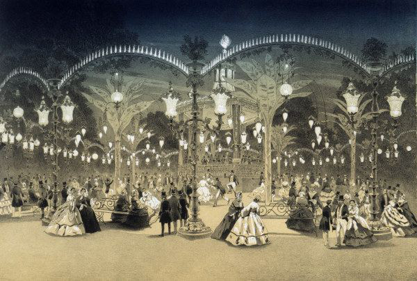 之前提到过“马逼园”即Jardin Mabile,这个地方最初由舞蹈教练马比尔(Mabille)开办,最初只面向自己的学员,后来也对公众开放。1844年他的儿子们对这里进行扩建和装修,配备了铁椅和灌木,还安装了3000盏煤气灯。这个灯的数量相当惊人,二十一年后上海成为中国最早安装公共煤气灯的城市,初装数量仅10盏。德彝说这里的门票男士3法郎女士1法郎,在当时是比较贵的,可以说门槛较高,一度成为巴黎最红的夜场。1870年普法战争期间这座园子被炮弹击中停业,1875年关闭,1882年拆除。