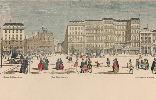 “梦马大街”即蒙马特大街(Rue Montmartre),这条街道南北向,与东西向的蒙马特大道(Bd Montmartre)相连,在路口东侧曾经又座市场(Bazar de l’Industrie),也就是德彝说的“巴萨日”(Bazar)。我没有找到这座市场当年的照片,不过找到了不少文字资料:市场出自建筑师保罗·勒隆(Paul Lelong, 1799-1846)之手,建于1827-1829年间,是第一个使用铸铁结构建造的两层建筑(P. D. Smith, City: S Guidebook for the Urban Age, 2012, p238),根据当年的一本介绍巴黎的小册子(Paris et les parisiens au XIXe siècle, 1856, P461)描述,这座市场基本上北京曾经的天意、万通市场差不多,确实挺吸引人的。