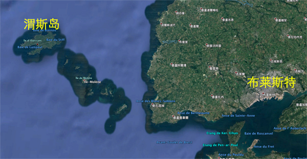 十九日丁丑,晴,暖。……午初一刻,抵法国西北界布来斯海口。先见其渭斯岛,长十五六里,不甚高,林木亦少。上立灯楼,百里可望。至此住船。楼房点缀,船只不多。炮船五只,内置大小铜炮一百八十门。后有轮舟来接,下船者,男女二十余人。未初,有德威理亚、殷柏尔由巴里来迎。申初,开船出口。北行,见左右山皆不高。稍转东南,长山一带,嵯峨撑空。入夜,风起浪涌,船即颠扬。