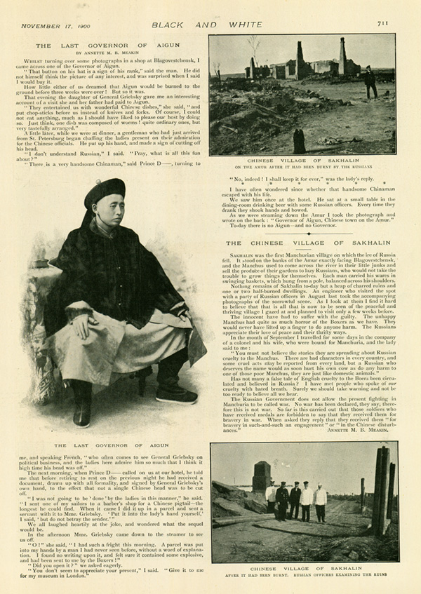 九年前,与秦风合作一本外国画报里的中国历史书,收录了一版1900年11月17日的英国画报《黑与白》(Black & White),这一版里有一篇名为“瑷珲的最后一任长官”(The Last Governor of Aigun)的文章,作者安内特·梅金(Annette Mary Budgett Meakin, 1867-1959),她和她母亲是首次乘火车穿过西伯利亚从欧洲去日本的女性(1900年),这篇文章就节选、改编自她此行的游记《铁纽带》(A Ribbon of Iron,1901年出版)。今天找资料的时候又看到这张扫描件,重新翻译后分享出来,我水平有限,还请诸位多多指教。