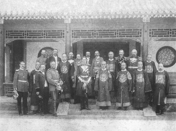 那桐走在队伍的一侧,后面跟着胡燏棻,联芳走在队伍中间和外国人在一起