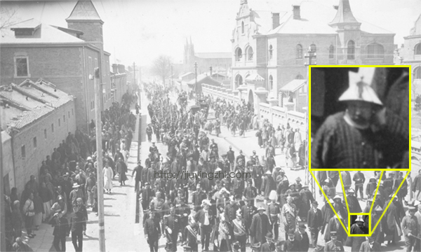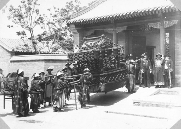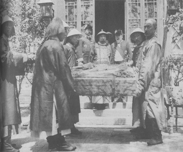 众人将慈禧太后的照片抬进法国使馆,站在那桐旁边的是法国公使吕班