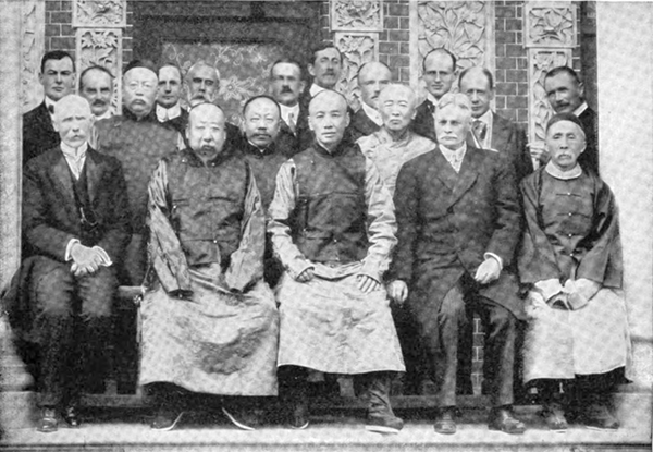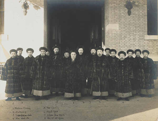 精琪(Jeremiah Whipple Jenks)是美国的经济学家,来中国推销他的币值改革方案。前排从左至右分别为:美国公使康格、荣庆、鹿传霖、精琪、那桐、陈璧,后排左二为绍英、左三徐世昌、左五雷谱桐、左六瑞丰、左七施肇基、左八张允言。