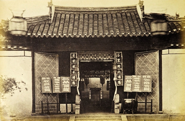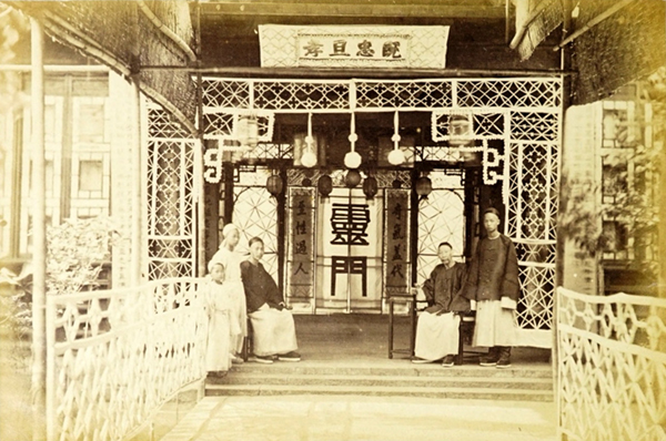 冯焌光的父亲在伊犁戍所病故,他负柩东归后在上海病逝。《远东》杂志1878年的5月和6月号总共刊登了三张冯焌光灵堂的照片,并配有长文说明,借着这些文字,可以确定其中几位主要人物的身份。5月号刊登了一张,照片左边披麻戴孝两个站着的年轻人是冯焌光的儿子冯启勋和冯启钧,坐在两个年轻人身边的是冯焌光的弟弟冯瑞光。右边这位长者是“李大人”,“翰林院官员、著名诗人,他的孙子将要娶冯焌光的女儿为妻,但因为丧礼的缘故,婚礼必须要延后了。”6月号刊登了两张照片,其中之一是求志书院的第二道大门,说冯道台去伊犁期间书院是“其家人居所”。门两边各插有三面牌子,分别是“二品顶戴”、“江苏苏松太兵备道”和“监督江南海关”,门口还有一副挽联:“梦里关山远隔,庭前风木增悲”。进了这道门是座影壁,影壁前有个木牌,简要介绍了冯焌光的生平。过了这道影壁,后面就是5月号里的那张“灵门”,过了灵门就是第四进院子的冯焌光的灵堂,即6月号里的第二张照片。《远东》的报道里还有一个细节,“作为感谢,葬礼的主持者给每个前来参加葬礼的外国友人发放了一张冯道台的石版肖像画”,我猜测应该就是之前朋友提到过的那张素描。从照片看,灵堂正中挂着一张冯焌光的传统肖像画,而不是这个版本中所说的“水粉画”。还有一个细节,文中提到出席冯焌光的欧洲人和日本人送来了花圈,说明冯的形象似乎在外国人眼中并不坏,不像是那个反对建铁路,大喊“将卧铁辙中听其轧死”的人啊……