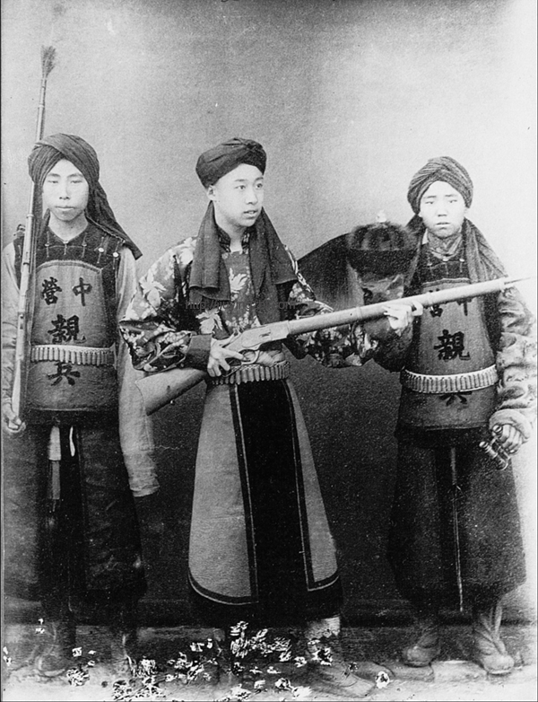 老照片里这款步枪,从扳机后部的杠杆式上弹机构就可以看出来这是温彻斯特步枪,超长的护木和三个金属箍可以确定是M1873 Musket型。三人腰间都缠着子弹带,中间这位虽然面相尚稚嫩,但看着洋洋得意,明显是个军官,旁边有随从拿着他的顶戴和双筒望远镜。有意思的是这位军官的手指甲很长,想来应该会影响射击速度吧……