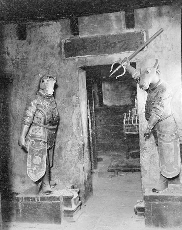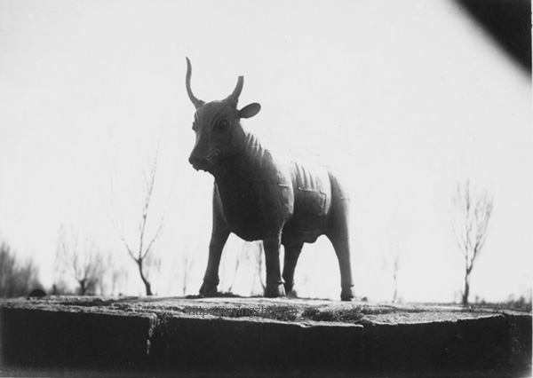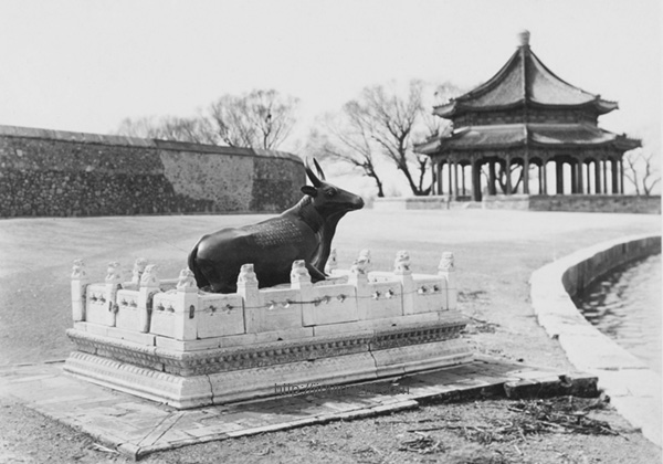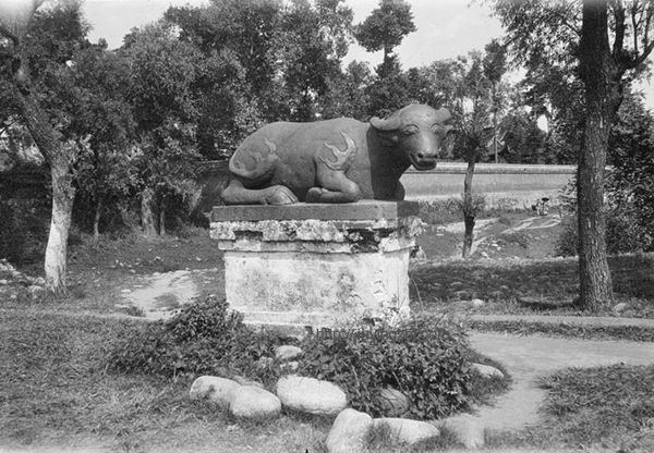 驯化的牛和人类共同生活的这差不多一万年时间里,有很多性格特质被升华为文化符号,比如南方的水牛,无论在沼泽型还是江河型,都是一幅泰然自若的样子,《易经》里说“牛象坤,坤为土,土胜水。”于是牛就成为一种可以镇水的符号,最知名的例子可能就是北京颐和园昆明湖东岸的铜牛,铸造于清乾隆二十年(1775年),牛身上有乾隆皇帝撰写的《金牛铭》,其中就有“金写神牛,用镇悠永。巴邱淮水,共贯同条。”别看昆明湖不会发大水,但放在湖边对国内其他地方的河流都起作用:“巴邱淮水,共贯同条”。石景山西南,永定河岸的庞村,曾建有祭祀(永定)河神的北惠济庙(雍正七年建),庙前不远的堤岸旁有座高2米左右的砖台,台上卧着一头铁铸的镇水牛,我考证大概铸于清嘉庆年间,1958年大炼钢铁的时候被化了。永定河古称“无定河”,就是因为水患频发经常改道而得名,后来为了讨个好彩头才改为“永定”。就在永定河的上游,山西大同境内的御河(后流入桑干河)河边也有一头铁铸的牛立在河旁,同样是为了祈祷减少水患。四川灌县的都江堰是中国历史上最著名的水利工程之一,那里也曾有只铁牛,据县志铸造于明嘉靖二十九年(1550年):“水利佥事施千祥、崇宁知县刘守德、灌县知县王来聘、顺庆府通判张仁度设计都江堰铁牛鱼嘴。二月二十四日冶铁浇铸,一昼夜而铁牛成,用铁七万斤。”(这个用铁量从照片来看似乎不准确)