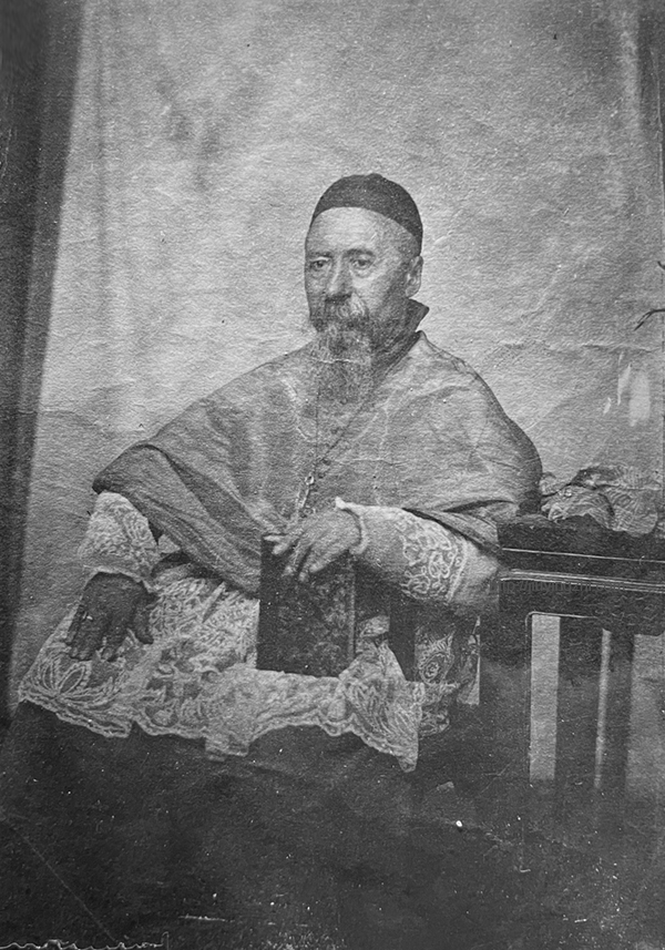 前阵子看到一张在售的外国人肖像照,注释为“Missionnaire en Chine”,我认出来那是曾经负责罗马天主教北京教区的孟振生主教。他的单人肖像除此之外我见过三张,都是在中国拍摄的,一张是维基百科上他的条目下配图,戴着祭巾,这种中西合璧的搭配只有在华传教士士使用,是罗马教廷的“特赐恩典”;一张是数年前朋友收藏的两本相册中的一张,穿着礼服戴着主教礼帽;还有一张质量不好,再有就是这张,戴着小圆帽,长及肘的披肩下方是蕾丝装饰的上衣。我关注他的这几张照片主要是照片里中式的照相馆元素,但这不是我以下文字的初衷,因为我发现他在中法《北京条约》签署前后所扮演的角色在不同的文本里呈现不同的面貌,可以展开一些讨论。