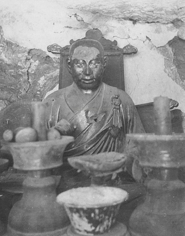 桂芳海岫和尚出生于明万历四年(1576),自幼在保定府的白衣庵出家,清康熙年间入北京西山的大圆通寺,他“笃实持躬,勤劳砥行,箪瓢布衲,十载经营,重新殿庑。”于是康熙皇帝赐名重修的大圆通寺为圣感寺,钦命桂芳海岫和尚为该寺的开山住持,这座寺庙在乾隆年间更名为香界寺,即八大处的第六处。桂芳海岫和尚常在圣感寺北的宝珠洞内修行,最后也圆寂于此,康熙皇帝“仍赐白金为殡资,其徒寂印,奉师全身。”这是其金身像说法的来历。关于桂芳海岫和尚的传说很多,据说他帮乾隆皇帝驱了鬼于是被封为“鬼王菩萨”,实际上据《五灯全书》他逝于清康熙二十五年(1686),最后葬在宝珠洞以北,广禧寺以西的塔内。他的弟子寂印“奉师全身”想来应该只是给等身的塑像施金,而不是在肉身上。这一猜测从这张老照片里也可以得到证实,桂芳海岫和尚塑像额头和胸口的伤痕显然是有人为了验证是否内有肉身而故意破坏的,特别是胸口那处伤痕,极似枪击的结果。这张照片摄于1920年代,不知金身像最后毁于何时。
