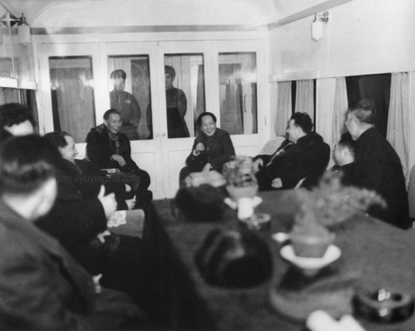 除了上面这条对摄影师意图和技巧的“分析”,似乎应该还考虑一种可能,即最后呈现出来的结果是摄影师不得已而为之的。这两张照片中的空间,一个是狭长的车厢,一个是房间,毛都坐在了这个空间的一角,照片不好拍。侯波1949年调任中共中央办公厅警卫局摄影科科长,负责拍摄中央领导人,尤以为毛拍照为主。从照片上看,在车厢里大家这样的一个分布情况,如果想在一张照片上尽量多的拍下中央领导人(右二周恩来,右五刘少奇),最适合的机位就是车厢对角线的另一侧。第二张照片根据后面悬挂的画像(左为伏罗希洛夫,右为斯大林),这个房间不会太宽,摄影师正对的那一侧墙壁最多只有三扇窗户(如果还有还有别的窗户就肯定还要有别的领导人像,那样的话不会把斯大林摆在最右边,此外根据吊灯的位置也可以大体推断出那面墙只有三个窗户),也就是说照片左边以外没有太多的空间留给摄影师,他也只能在这个空间里以与毛为对角线的位置拍照。如果这个分析成立的话,这种(几乎)所有人目光聚集到毛身上的照片都不是摄影师的刻意为之,而是由于空间的限制以及毛所坐的位置使摄影师没有其他机位选择,不得已拍下的这种使毛得以突出的照片。