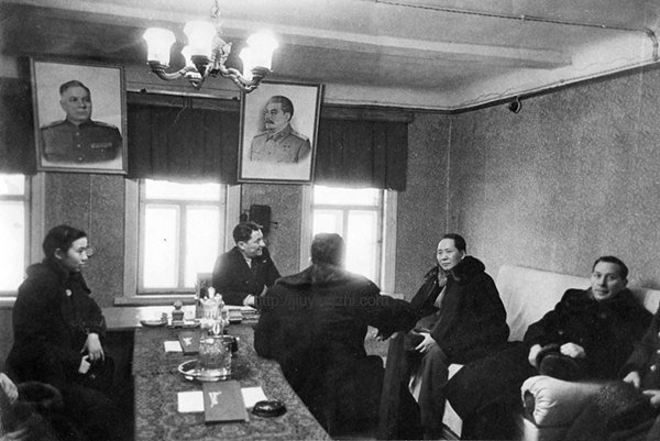 1949年11月上旬,毛泽东收到斯大林的邀请访问苏联,参加苏方举行的庆祝斯大林七十寿辰的活动。而中国方面则要与斯大林就中苏两国重大的政治、经济问题进行商谈,特别是处理1945年国民党政府与苏联签订的《中苏友好同盟条约》。1949年12月6日毛泽东乘专列从西直门火车站出发,12月16日抵达莫斯科雅罗斯拉夫车站。祝寿活动很快就结束了,但后续的废除旧条约签署新条约则花了很长时间,直到1950年2月17日毛泽东才登上回国的专列。毛在苏联的两个月中除了参加祝寿活动和开会,还去了列宁格勒和斯大林格勒的一些工厂、纪念馆和集体农庄参观,按说这段时间中苏双方都有机会留下丰富的影像资料,但实际上除了常见的那几张(只讨论照片不讨论视频,而且视频也不多),在互联网上很难检索到更多的照片。今天说的两张照片都不算太少见,但放在一起对照着看也有可讨论的空间。