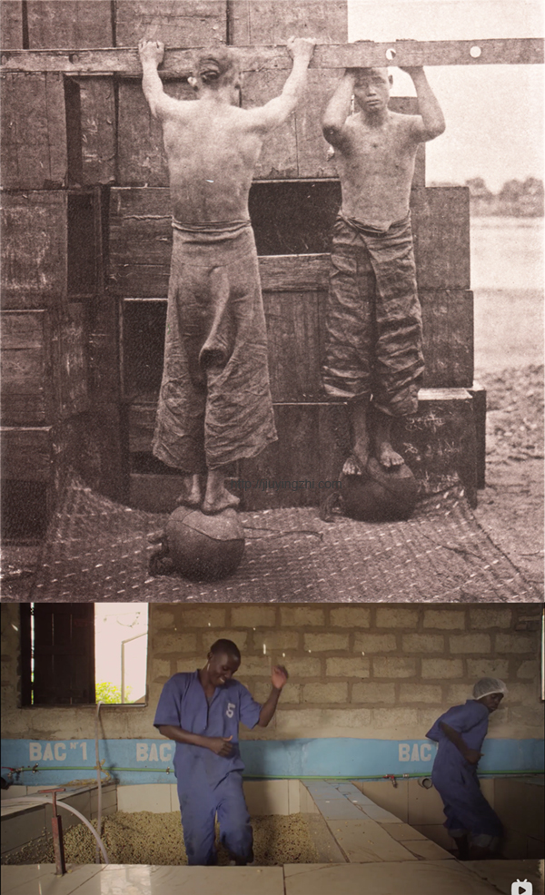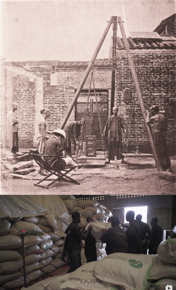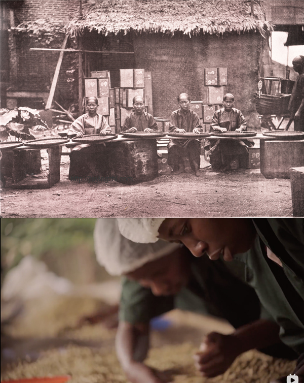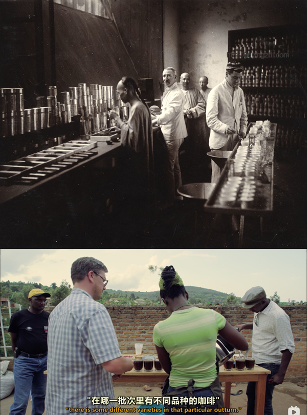 年前,B站的AI在我的首页推荐了一部纪录片《一部关于咖啡的电影》(A Film about Coffee)。我对咖啡没有依赖,但只要有条件,早上都会喝一杯咖啡,于是我点开链接看完了这部纪录片。其中讲到了卢旺达的灰山(Huye Mountain)咖啡豆加工过程,从采摘、水洗、拣选、晾晒到最后称量和包装,图像上的呈现让我联想到约翰·汤姆逊1870年在广东清远拍摄的一组照片,是当地的茶厂加工茶叶,从拣选、脚踩揉搓、称重装箱的过程,很多场景可以与灰山咖啡豆的加工一一对应。此外,这部纪录片中有美国的进口商与卢旺达当地的咖啡豆生产商为不同批次的豆子品鉴分级的过程,而清代由外国人主持的茶叶品鉴分级也有照片留下来(汤姆逊拍的没有外国人,我找了一张差不多同一时期且有外国人的),可以放在一起比较。