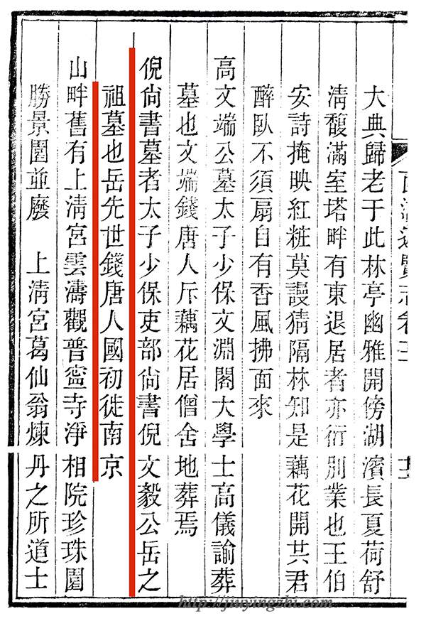 地图里没有就去查方志。中国古代方志前一般都有图志,主要是疆域、水道一类,不过宋、明、清时期杭州地方志的图志部分在那本《杭州古旧地图集》里都有收录,所以我主要从文字中寻找。最后我在明代田汝成编撰的《⻄湖游览志》中找到了线索:在净慈寺之后的条目是“净慈寺前为雷峰塔、藕花居、倪尚书墓”,[10]以净慈寺为基点,将这三个地点放在同一条目下,说明都是重要且显眼的文化地标。隔⻚对“倪尚书墓”有详细说明:“倪尚书墓者,太子少保吏部尚书倪文毅公岳之祖墓也,岳先世钱唐人,国初徙南京。”倪岳(1444-1501),字舜咨,号⻘谿,上元(今南京)人,天顺进士,授编修。《明史》载其“好学,文章敏捷,博综经世之务”。弘治间累官礼、吏部尚书。[11]总之,倪岳饱读诗书,写得一手好文章,作为官员来说⻛评也不错,明弘治十三年(1500)他迁任北京吏部尚书,次年病逝,赠少保,谥文毅。[12]倪岳的父亲叫倪谦,果然在明清时候杭州的方志中能查到倪谦墓的记载,如清光绪十四年的《杭州府志》“冢墓”下有“礼部尚书谥文禧倪谦墓,在南屏山麓(康熙志)”[13];清乾隆四十九年的《杭州府志》中“礼部尚书谥文禧倪谦墓,在南屏山麓(旧志)”[14];清康熙五十七年《钱塘县志》“南京礼部尚书谥文禧倪谦墓,在南屏山麓”。[15]
