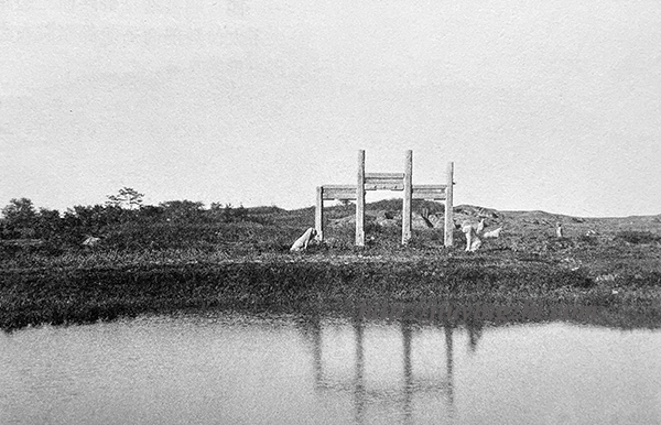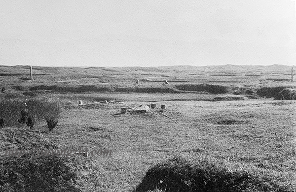 从苏家山上向西看,可见倪氏祖墓石牌楼,近处的白点都是墓碑,1910年代