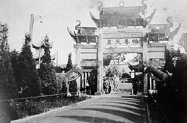 20世纪30年代杭州汪庄内的石牌楼,一面写着“怡养天真”,可见一对石马