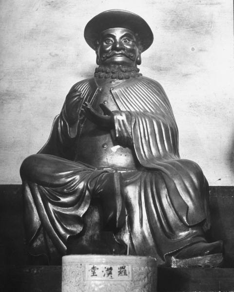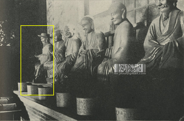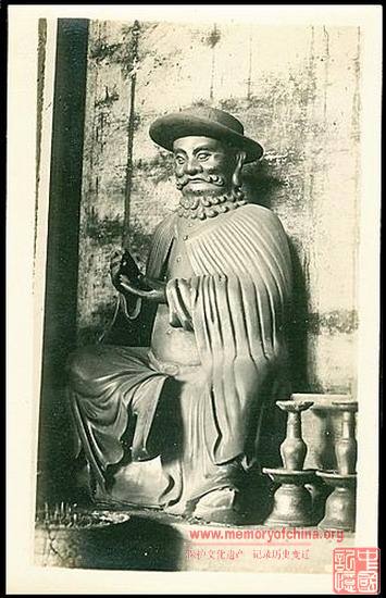 五百罗汉堂建设比较晚,加之广州开放较早,因此留下的影像很多,甚至在建设罗汉堂之前,汤姆逊就曾在1870年访问、拍摄过华林寺。罗汉堂中原有的罗汉像,系拌有纸筋的泥塑,外涂金漆,神态各异。其中最特别的一尊据说是按照马克•波罗的形象制作的。19世纪罗汉堂内景的照片多见,但是这尊“马可•波罗”像的照片却难见。我想主要原因是早期拍摄8×10底片的大机器是“定焦镜头”,不方便拍摄近距离的物体,而堂内巷道宽度有限,施展不开。从现存的照片来看,基本上都是大全景,没有某座罗汉像的特写。一直到了1900年后,明胶照片和镜头技术发展了,才有了部分特写。尽管很少,我还是搜集到几张罗汉堂内“马可•波罗”像的照片。