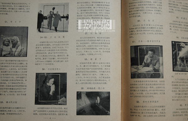 年鉴中中收录了反映工农业建设的作品如石少华的《钢锭》、吴新陆的《女工》、刘宝成的《钢都》、陆文骏的《农业社社长——李为光》、蔡尚雄的《优秀饲养员——彭桂英》、陈正青的《咖啡园的早晨》等,反映军队建设的作品如柳成行的《前进的行列》、高帆的《水兵》、于志的《归来》,中国摄影史上的经典作品如李仲魁的《在结婚登记处》、柯复、王一波的《过马路》、薛子江的《千里江陵一日还》等,特别是里面收录了一些60年代几乎看不到的静物或风景作品,如张印泉的《丹枫宝塔》、金石声的《昆明湖》、吴寅伯的《筏》、黄翔的《黄山雨后》等,还有香港及海外华人的摄影作品。这本画册我最喜欢的是最后一部份“年鉴摄影作品的拍摄经过”,里面由摄影师自己讲述了作品的拍摄经过,裁减情况等,是非常重要的资料。