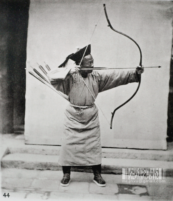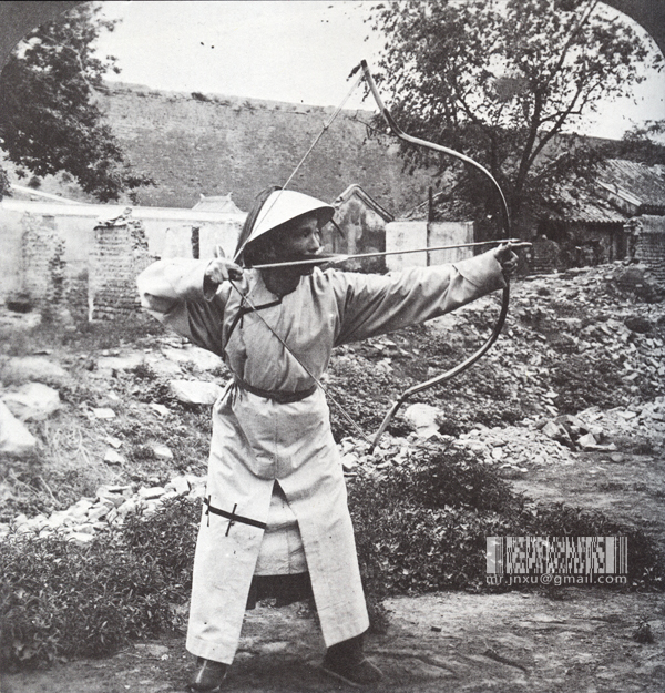 佚名摄影师1900年拍摄的北京的弓箭手,射手的姿态,弓箭的形式都一样,只是看起来背景应该是被八国联军蹂躏之后,再好的弓箭手也无法抵挡坚船利炮。