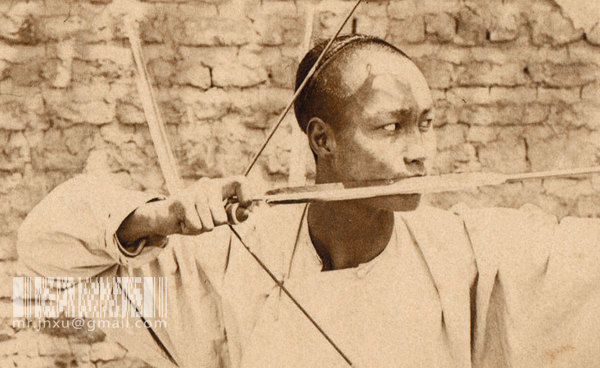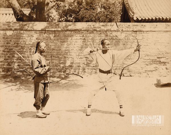 佚名摄影师拍摄于1900年前后。我非常喜欢这张照片,特别是里面正在拉弓的年轻人,别看清瘦,却稳扎马步,拉弓后仍能保证身体笔直,这范儿实在太帅了!