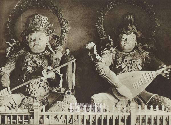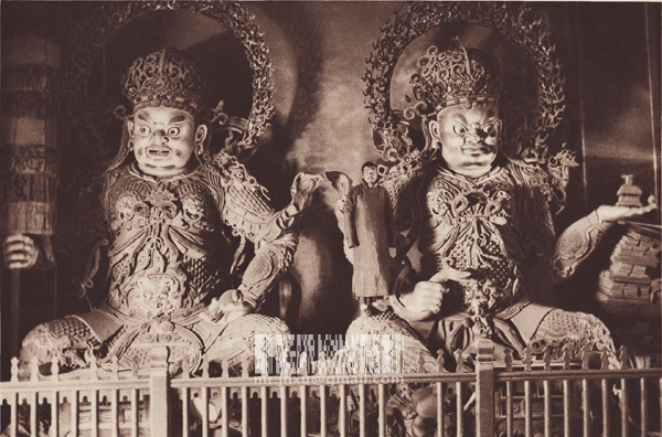 在现存的影像资料中,东黄寺天王像流传最广的一张照片出自德国摄影师汉茨•冯•佩克哈默(Heinz von Perckhammer, 1895-1965)之手。他出生在奥地利,父母都从事过照相馆业,参军后和中国结缘,热爱中国文化,多次来中国摄影,几乎走遍了大江南北。1928年发行的《北京美观》一书中收录这张照片。东黄寺的天王像高大、壮硕,表情丰富,带圆形背光,甲胄的细节逼真,泥塑丝巾的飘逸感强,是非常精美的艺术品(可惜现在没人有这样的手艺了)。一个中国人(可能是看守寺院的人)站在西方广目天王的腿上。非常凑巧,我在翻找资料的时候在一本德文书中找到了东黄寺内另外一侧的天王像照片,同样是由佩克哈默所摄,同样是那个中国人站在天王腿上(只不过这次换作了南方增长天王)。佩克哈默本意是让这个中国人可以作为比对塑像大小的“比例尺”,却没有想到成就了一个人的两场演出!