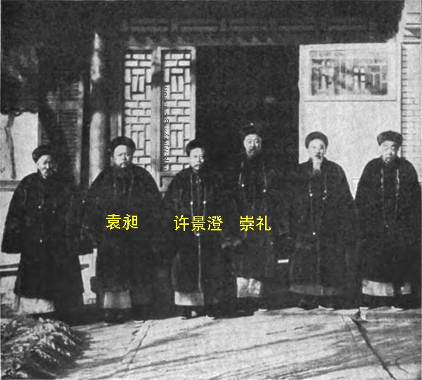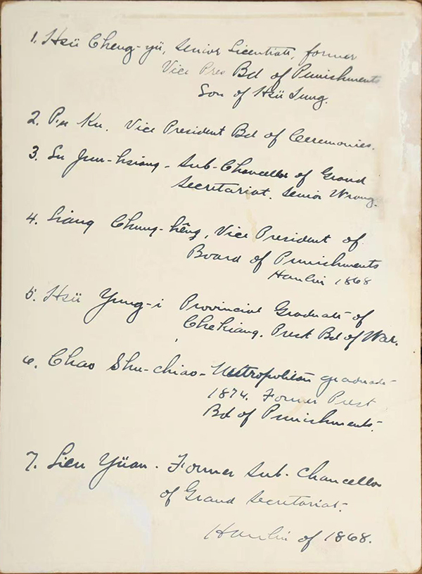 1 Hsü Cheng-yü, Senior Licentiate, former Vice Pres Bd of Punishments, Son of Hsü Tung 2 Pu Ku, Vice President Bd of Ceremonies 3 Lu Jun-hsiang, Sub-chancellor of Grand Secretariat, Senior Wrang 4 Liang Chung-hêng, Vice President of Board of Punishments, Hanlin 1868 5 Hsü Yung-I, Provincial graduate of Chekiang, Pres Bd of War 6 Chao Shu-Chiao, Metropolitan, graduate 1874, Former Pres Bd of Punishments 7 Lien Yüan, Former Sub-Chancellor of Grand Secretariat, Hanlin of 1868