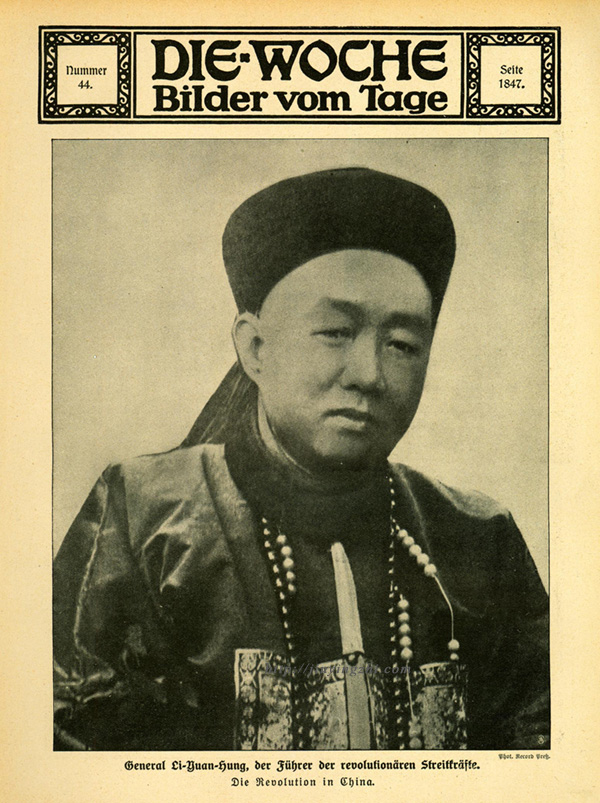 2011年在台湾出版的《辛亥革命现场报导》是一套收集外国报刊中辛亥革命报道的以图片为主的书,其中收录了德国《周刊》杂志(Die Woche: Bilder vom Tage)的一页,是1919年11月发行,第44期的整版,内容是一位穿着清代补服的官员,原图下面的文字说明是“革命战士的领袖黎元洪将军,中国革命”(Gereral Li-Yuan-hung, der Führer der revolustionären Streittäfte. Die Revolution in China)。这里的“中国革命”是指辛亥革命,黎元洪在这个中国历史重要的转折事件中扮演了关键角色,这篇报道虽然已经距离辛亥首义已经好几年,但内容新鲜,特别是图片新鲜,所以被选进了2011年那套书。《周刊》杂志1899年在德国柏林创刊,创办之初就定位在图片报道上,突出的就是图,1944年因为战争的原因而中断出版。编辑阶段我给这页杂志写说明文字的时候,总觉得画中人的五官并不很像黎元洪,但当时没有深入考究,当时对国外报刊这类史料也比较信任,就这么过去了,直到前几天无意间发现了新材料,才知道被这份报纸误导了,还是应该相信自己对五官的辨认能力。