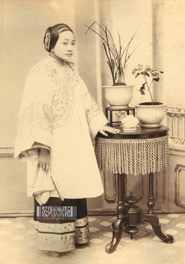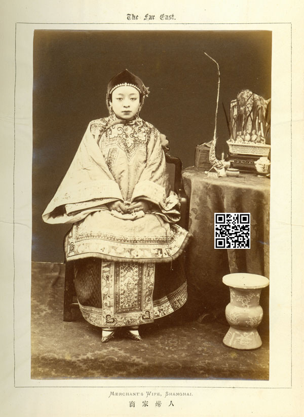 1876年8月号的The Far East杂志上登有一张照片,是一个盛装贵妇端坐在椅子上,小脚,不是青楼女子,从头饰看已婚,按说应该是某有钱人家的阔太太,但是左、右手中指各戴有四枚戒指,很俗!(一般这么戴戒指的都是青楼女子,也许这姑娘是后来从良的。)旁边的茶几上有个西域风格的水烟壶,一摞书,一盒洋火,一个小盅,一套茶碗,还有一盆水仙。水仙盘样子怪,侧面好像有很多孔,但是肯定不会是孔(否则会漏水的)。照片的背景被修整掉了,而且手艺有点儿糙,人物和水仙的边缘还不清晰。照片下面的说明文字是“MERCHANT’S WIFE, SHANGHAI 商家妇人”。